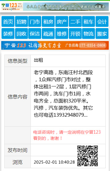 老宁高路,东南汪村北西段,1众辉汽修门市对过,整体出租1一2层,1层汽修门市两间,洗车门市1间,水电齐全,总面积320平米。汽修,汽车装饰优先。其它也可电话13932948079 【电话咨询时,请一定说明在宁晋123看到的,谢谢!】 |