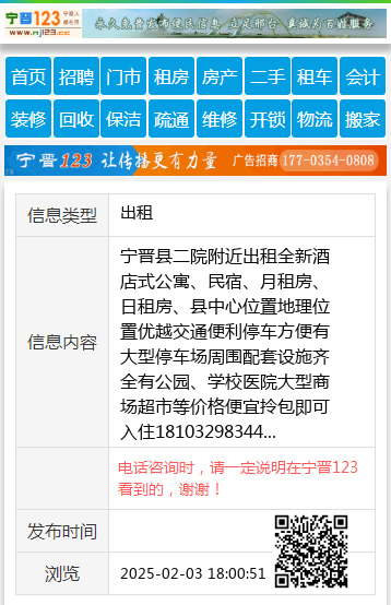 宁晋县二院附近出租全新酒店式公寓、民宿、月租房、日租房、县中心位置地理位置优越交通便利停车方便有大型停车场周围配套设施齐全有公园、学校医院大型商场超市等价格便宜拎包即可入住18103298344 【电话咨询时,请一定说明在宁晋123看到的,谢谢!】 |