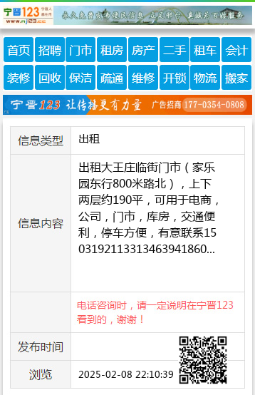 出租大王庄临街门市(家乐园东行800米路北),上下两层约190平,可用于电商,公司,门市,库房,交通便利,停车方便,有意联系1503192113313463941860 【电话咨询时,请一定说明在宁晋123看到的,谢谢!】 |