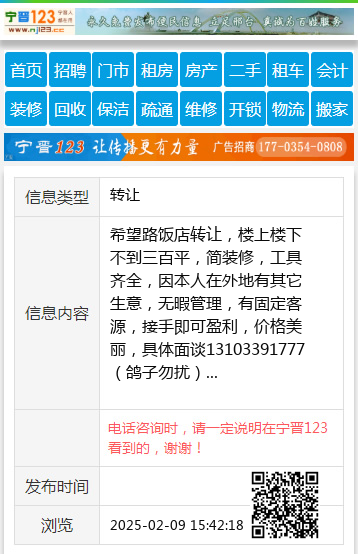 希望路饭店转让,楼上楼下不到三百平,简装修,工具齐全,因本人在外地有其它生意,无暇管理,有固定客源,接手即可盈利,价格美丽,具体面谈13103391777(鸽子勿扰) 【电话咨询时,请一定说明在宁晋123看到的,谢谢!】 |