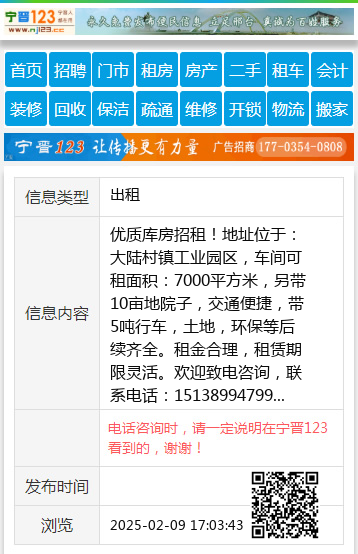 优质库房招租!地址位于:大陆村镇工业园区,车间可租面积:7000平方米,另带10亩地院子,交通便捷,带5吨行车,土地,环保等后续齐全。租金合理,租赁期限灵活。欢迎致电咨询,联系电话:15138994799 【电话咨询时,请一定说明在宁晋123看到的,谢谢!】 |
