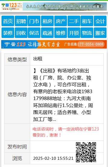】《出租》有场地约3亩出租(厂房、院、办公室、独立水电),可合作可出租,有意向的老板来电洽谈19831799888地址:九河大街南环加油站南行1.5公里处,周围无居民;适合养殖、小型加工厂等 【电话咨询时,请一定说明在宁晋123看到的,谢谢!】 |