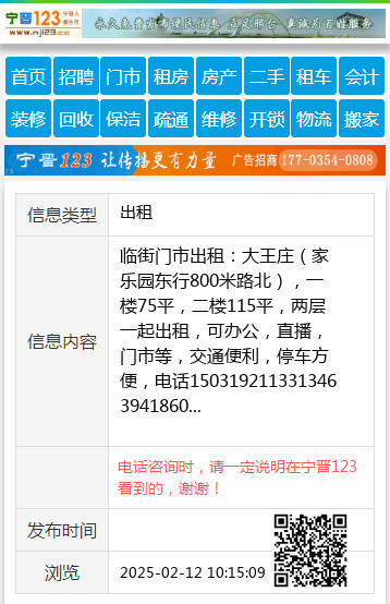 临街门市出租:大王庄(家乐园东行800米路北),一楼75平,二楼115平,两层一起出租,可办公,直播,门市等,交通便利,停车方便,电话1503192113313463941860 【电话咨询时,请一定说明在宁晋123看到的,谢谢!】 |