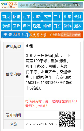 出租大王庄临街门市,上下两层190平米,整体出租,可用于办公,直播,库房,门市等,水电齐全,交通便利,门前可停车,有意电联1503192113313463941860非诚勿扰 【电话咨询时,请一定说明在宁晋123看到的,谢谢!】 |