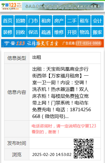 出租:天宝街凤凰商业步行街西邻【万家福月租房】一室一卫一厨!内设:空调!洗衣机!热水器浴霸!双人床衣柜!每楼层免费独立宽带上网!门禁系统!电动车免费充电!电话:18714256668(微信同号) 【电话咨询时,请一定说明在宁晋123看到的,谢谢!】 |