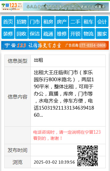 出租大王庄临街门市(家乐园东行800米路北),两层190平米,整体出租,可用于办公,直播,库房,门市等,水电齐全,停车方便,电话1503192113313463941860 【电话咨询时,请一定说明在宁晋123看到的,谢谢!】 |