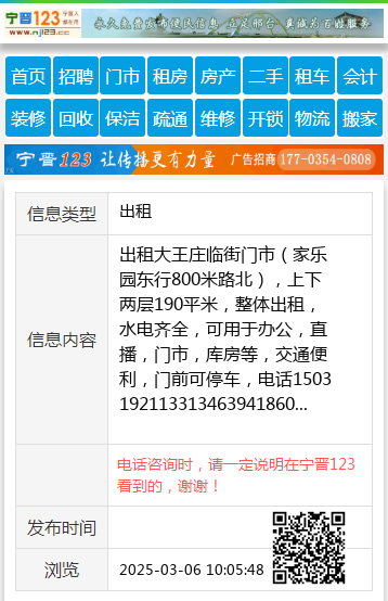 出租大王庄临街门市(家乐园东行800米路北),上下两层190平米,整体出租,水电齐全,可用于办公,直播,门市,库房等,交通便利,门前可停车,电话1503192113313463941860 【电话咨询时,请一定说明在宁晋123看到的,谢谢!】 |