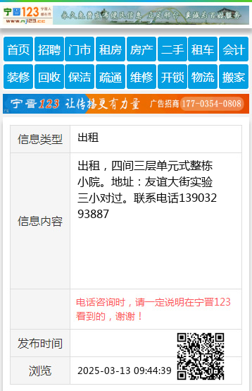 出租,四间三层单元式整栋小院。地址:友谊大街实验三小对过。联系电话13903293887