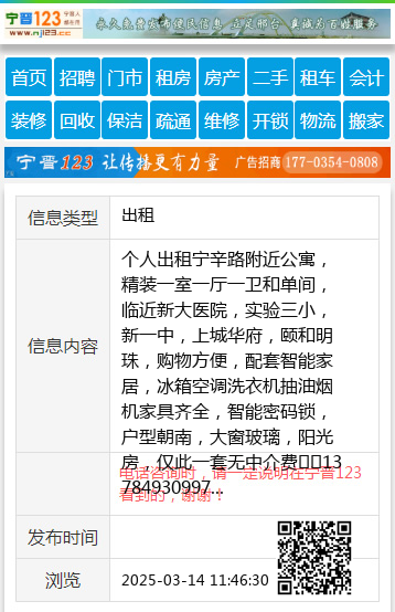 个人出租宁辛路附近公寓,精装一室一厅一卫和单间,临近新大医院,实验三小,新一中,上城华府,颐和明珠,购物方便,配套智能家居,冰箱空调洗衣机抽油烟机家具齐全,智能密码锁,户型朝南,大窗玻璃,阳光房,仅此一套无中介费☎️13784930997 【电话咨询时,请一定说明在宁晋123看到的,谢谢!】 |