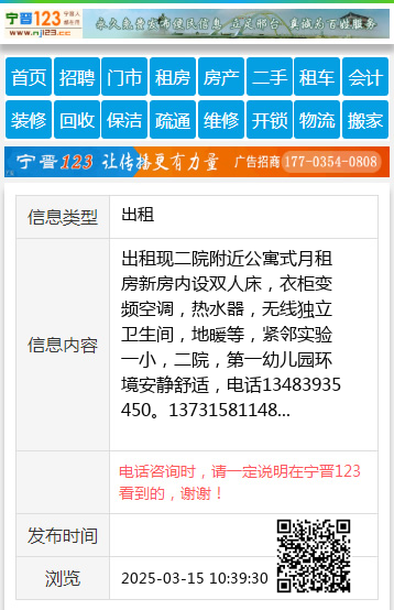 出租现二院附近公寓式月租房新房内设双人床,衣柜变频空调,热水器,无线独立卫生间,地暖等,紧邻实验一小,二院,第一幼儿园环境安静舒适,电话13483935450。13731581148 【电话咨询时,请一定说明在宁晋123看到的,谢谢!】 |