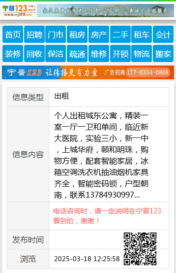 个人出租城东公寓,精装一室一厅一卫和单间,临近新大医院,实验三小,新一中,上城华府,颐和明珠,购物方便,配套智能家居,冰箱空调洗衣机抽油烟机家具齐全,智能密码锁,户型朝南,联系13784930997 【电话咨询时,请一定说明在宁晋123看到的,谢谢!】 |