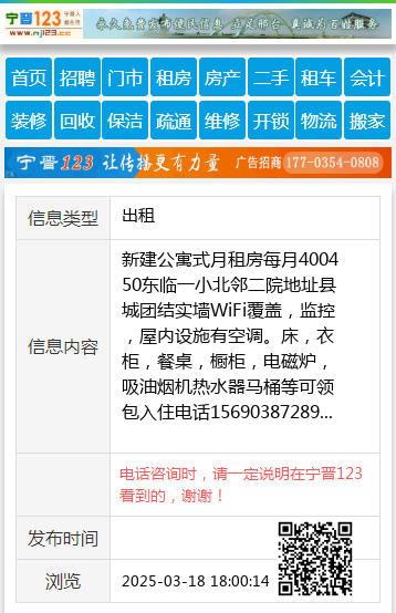 新建公寓式月租房每月400450东临一小北邻二院地址县城团结实墙WiFi覆盖,监控,屋内设施有空调。床,衣柜,餐桌,橱柜,电磁炉,吸油烟机热水器马桶等可领包入住电话15690387289 【电话咨询时,请一定说明在宁晋123看到的,谢谢!】 |