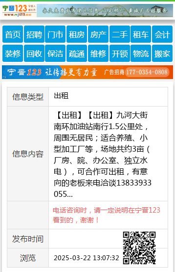 【出租】【出租】九河大街南环加油站南行1.5公里处,周围无居民;适合养殖、小型加工厂等,场地共约3亩(厂房、院、办公室、独立水电),可合作可出租,有意向的老板来电洽谈13833933055 【电话咨询时,请一定说明在宁晋123看到的,谢谢!】 |