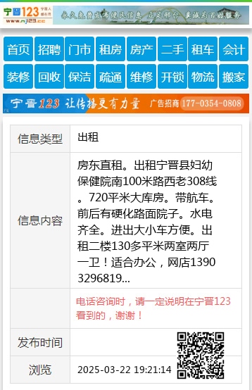 房东直租。出租宁晋县妇幼保健院南100米路西老308线。720平米大库房。带航车。前后有硬化路面院子。水电齐全。进出大小车方便。出租二楼130多平米两室两厅一卫!适合办公,网店13903296819 【电话咨询时,请一定说明在宁晋123看到的,谢谢!】 |