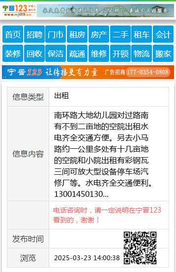 南环路大地幼儿园对过路南有不到二亩地的空院出租水电齐全交通方便。另去小马路约一公里多处有十几亩地的空院和小院出租有彩钢瓦三间可放大型设备停车场汽修厂等。水电齐全交通便利。13001450130 【电话咨询时,请一定说明在宁晋123看到的,谢谢!】 |