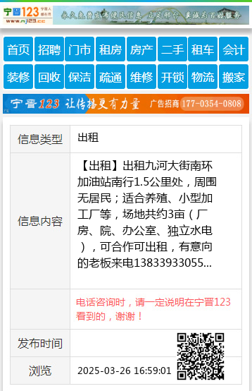 【出租】出租九河大街南环加油站南行1.5公里处,周围无居民;适合养殖、小型加工厂等,场地共约3亩(厂房、院、办公室、独立水电),可合作可出租,有意向的老板来电13833933055 【电话咨询时,请一定说明在宁晋123看到的,谢谢!】 |