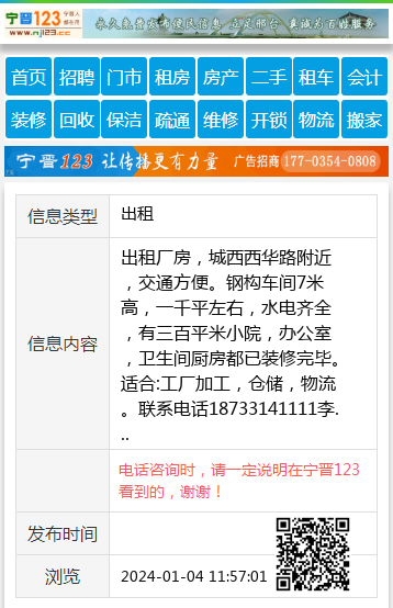出租厂房,城西西华路附近,交通方便。钢构车间7米高,一千平左右,水电齐全,有三百平米小院,办公室,卫生间厨房都已装修完毕。适合:工厂加工,仓储,物流。联系电话18733141111李 【电话咨询时,请一定说明在宁晋123看到的,谢谢!】 |