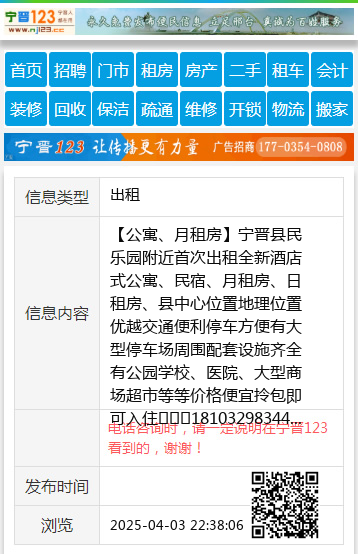 【公寓、月租房】宁晋县民乐园附近首次出租全新酒店式公寓、民宿、月租房、日租房、县中心位置地理位置优越交通便利停车方便有大型停车场周围配套设施齐全有公园学校、医院、大型商场超市等等价格便宜拎包即可入住18103298344 【电话咨询时,请一定说明在宁晋123看到的,谢谢!】 |