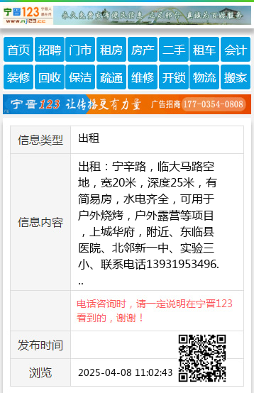 出租:宁辛路,临大马路空地,宽20米,深度25米,有简易房,水电齐全,可用于户外烧烤,户外露营等项目,上城华府,附近、东临县医院、北邻新一中、实验三小、联系电话13931953496 【电话咨询时,请一定说明在宁晋123看到的,谢谢!】 |