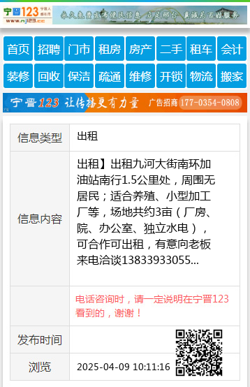 出租】出租九河大街南环加油站南行1.5公里处,周围无居民;适合养殖、小型加工厂等,场地共约3亩(厂房、院、办公室、独立水电),可合作可出租,有意向老板来电洽谈13833933055 【电话咨询时,请一定说明在宁晋123看到的,谢谢!】 |