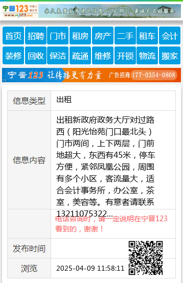 出租新政府政务大厅对过路西(阳光怡苑门口最北头)门市两间,上下两层,门前地超大,东西有45米,停车方便,紧邻凤凰公园,周围有多个小区,客流量大,适合会计事务所,办公室,茶室,美容等。有意者请联系13211075322 【电话咨询时,请一定说明在宁晋123看到的,谢谢!】 |