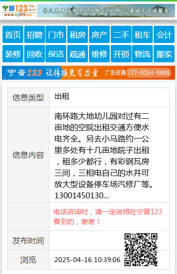 南环路大地幼儿园对过有二亩地的空院出租交通方便水电齐全。另去小马路约一公里多处有十几亩地院子出租,租多少都行,有彩钢瓦房三间,三相电自己的水井可放大型设备停车场汽修厂等。13001450130 【电话咨询时,请一定说明在宁晋123看到的,谢谢!】 |