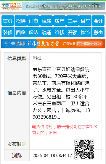 房东直租宁晋县妇幼保健院老308线。720平米大库房。带航车。前后有硬化路面院子。水电齐全。进出大小车方便。另出租二楼130多平米左右三室两厅一卫!适合办公,网店,非诚勿扰。13903296819 【电话咨询时,请一定说明在宁晋123看到的,谢谢!】 |