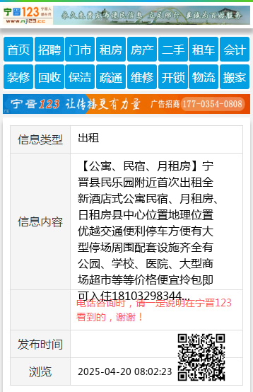 【公寓、民宿、月租房】宁晋县民乐园附近首次出租全新酒店式公寓民宿、月租房、日租房县中心位置地理位置优越交通便利停车方便有大型停场周围配套设施齐全有公园、学校、医院、大型商场超市等等价格便宜拎包即可入住18103298344 【电话咨询时,请一定说明在宁晋123看到的,谢谢!】 |