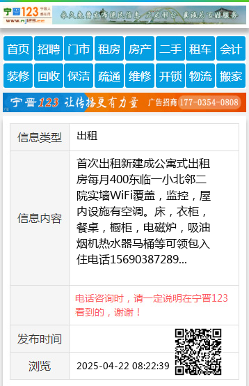 首次出租新建成公寓式出租房每月400东临一小北邻二院实墙WiFi覆盖,监控,屋内设施有空调。床,衣柜,餐桌,橱柜,电磁炉,吸油烟机热水器马桶等可领包入住电话15690387289 【电话咨询时,请一定说明在宁晋123看到的,谢谢!】 |