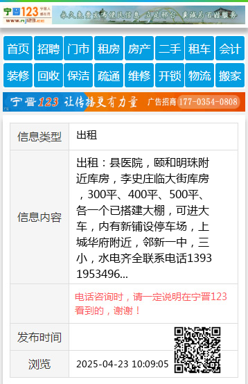 出租:县医院,颐和明珠附近库房,李史庄临大街库房,300平、400平、500平、各一个已搭建大棚,可进大车,内有新铺设停车场,上城华府附近,邻新一中,三小,水电齐全联系电话13931953496 【电话咨询时,请一定说明在宁晋123看到的,谢谢!】 |