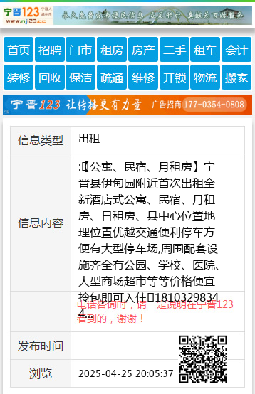 【公寓、民宿、月租房】宁晋县伊甸园附近首次出租全新酒店式公寓、民宿、月租房、日租房、县中心位置地理位置优越交通便利停车方便有大型停车场,周围配套设施齐全有公园、学校、医院、大型商场超市等等价格便宜拎包即可入住18103298344 【电话咨询时,请一定说明在宁晋123看到的,谢谢!】 |