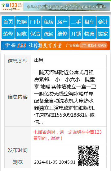 二院天河城附近公寓式月租房紧邻.一小二小六小二院童泰.地暖.实体墙独立一室一卫一厨免费无线空调冰箱单屋配备全自动洗衣机大床热水器独立卫浴电磁炉抽油烟机。住房热线15530918881同微信 【电话咨询时,请一定说明在宁晋123看到的,谢谢!】 |