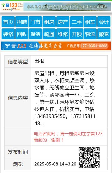 房屋出租,月租房新房内设双人床,衣柜变频空调,热水器,无线独立卫生间,地暖等,紧邻实验一小,二院,第一幼儿园环境安静舒适拎包入住,价格实惠。电话13483935450。13731581148 【电话咨询时,请一定说明在宁晋123看到的,谢谢!】 |