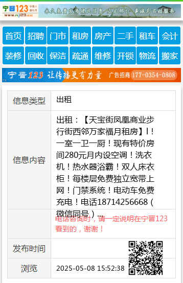 出租:【天宝街凤凰商业步行街西邻万家福月租房】l!一室一卫一厨!现有特价房间280元月内设空调!洗衣机!热水器浴霸!双人床衣柜!每楼层免费独立宽带上网!门禁系统!电动车免费充电!电话18714256668(微信同号) 【电话咨询时,请一定说明在宁晋123看到的,谢谢!】 |