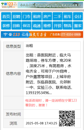出租:县医院附近,临大马路场地,停车方便,宽20米,深度25米,有简易房,水电齐全,可用于户外烧烤,户外露营等项目,上城华府附近、东临县医院、北邻新一中、实验三小、联系电话、13931953496 【电话咨询时,请一定说明在宁晋123看到的,谢谢!】 |