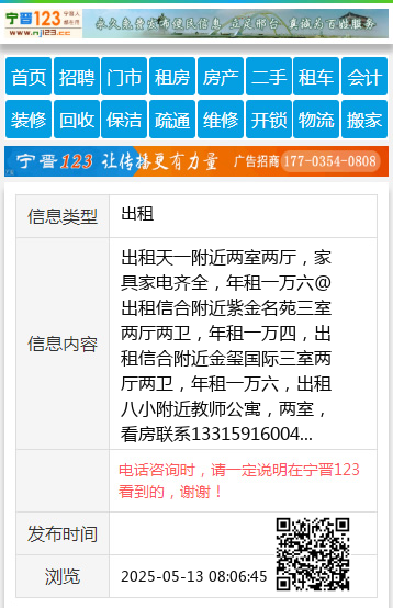 出租天一附近两室两厅,家具家电齐全,年租一万六@出租信合附近紫金名苑三室两厅两卫,年租一万四,出租信合附近金玺国际三室两厅两卫,年租一万六,出租八小附近教师公寓,两室,看房联系13315916004 【电话咨询时,请一定说明在宁晋123看到的,谢谢!】 |
