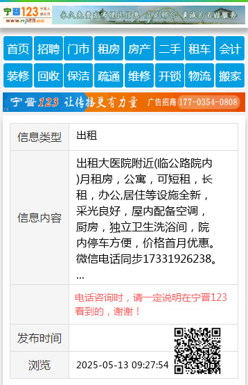 出租大医院附近(临公路院内)月租房,公寓,可短租,长租,办公,居住等设施全新,采光良好,屋内配备空调,厨房,独立卫生洗浴间,院内停车方便,价格首月优惠。微信电话同步17331926238。 【电话咨询时,请一定说明在宁晋123看到的,谢谢!】 |