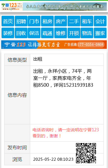 出租,永祥小区,74平,两室一厅,家具家电齐全,年租8500,详询15231939183