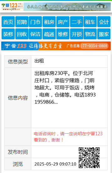 出租库房230平。位于北河庄村口,紧临宁隆路,门前地超大。可用于饭店,烧烤,电商,仓储等。电话18931959866 【电话咨询时,请一定说明在宁晋123看到的,谢谢!】 |