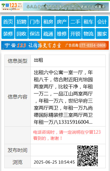 出租六中公寓一室一厅,年租八千,信合附近阳光怡园两室两厅,比较干净,年租一万二,一品江山两室两厅,年租一万六,世纪华府三室两厅两卫,年租一万九尚德国际精装修三室两厅两卫年租一万八13315916004 【电话咨询时,请一定说明在宁晋123看到的,谢谢!】 |