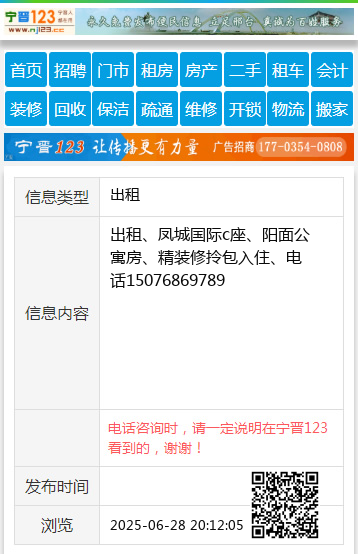 出租、凤城国际c座、阳面公寓房、精装修拎包入住、电话15076869789