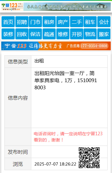 出租阳光怡园一室一厅,简单家具家电,1万,15100918003