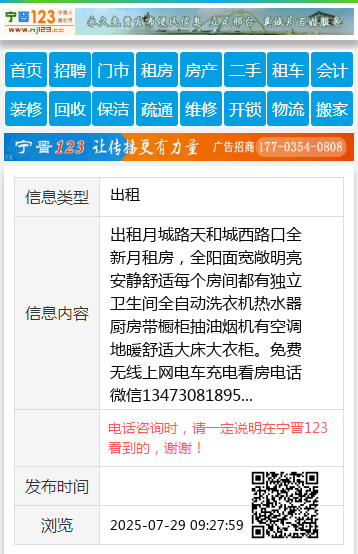 出租月城路天和城西路口全新月租房,全阳面宽敞明亮安静舒适每个房间都有独立卫生间全自动洗衣机热水器厨房带橱柜抽油烟机有空调地暖舒适大床大衣柜。免费无线上网电车充电看房电话微信13473081895 【电话咨询时,请一定说明在宁晋123看到的,谢谢!】 |