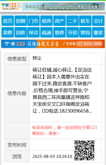 转让旺铺,诚心转让,【足浴店转让】因本人需要外出实在顾不过来,稳定客源,不缺客户,价格合理,接手即可营业,宁晋县西二环凤凰镇吉祥路和天宝街交叉口纤指阁足浴转让,☎️电话:18230096658 【电话咨询时,请一定说明在宁晋123看到的,谢谢!】 |