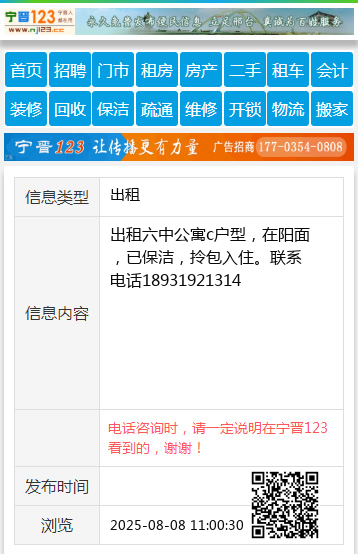 出租六中公寓c户型,在阳面,已保洁,拎包入住。联系电话18931921314