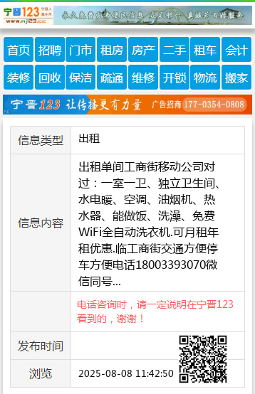出租单间工商街移动公司对过:一室一卫、独立卫生间、水电暖、空调、油烟机、热水器、能做饭、洗澡、免费WiFi全自动洗衣机.可月租年租优惠.临工商街交通方便停车方便电话18003393070微信同号 【电话咨询时,请一定说明在宁晋123看到的,谢谢!】 |