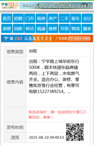 出租:宁辛路上城华府东行500米,顺丰快递东临商铺两间,上下两层,水电燃气齐全。适合办公、装修、零售批发等行业经营,有意可电联15227389214。 【电话咨询时,请一定说明在宁晋123看到的,谢谢!】 |