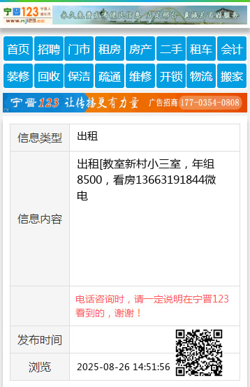 出租[教室新村小三室,年组8500,看房13663191844微电