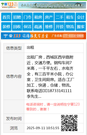 出租厂房,西城区西华路附近,交通方便。钢构车间7米高,一千平左右,水电齐全,有三百平米小院,办公室,卫生间厨房。适合:工厂加工,快递,仓储,物流。联系电话18733141111李先生 【电话咨询时,请一定说明在宁晋123看到的,谢谢!】 |