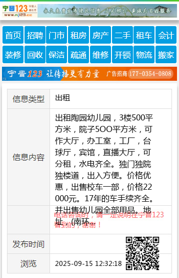出租陶园幼儿园,3楼500平方米,院子5OO平方米,可作大厅,办工室,工厂,台球厅,宾馆,直播大厅,可分租,水电齐全。独门独院独楼道,出入方便。价格优惠,出售校车一部,价格22000元。17年的车手续齐全。并出售幼儿园全部用品。地址,(南环路)九河大街中段,世爵公馆对面路南,电话13102582678,13223280678(同微信)。 【电话咨询时,请一定说明在宁晋123看到的,谢谢!】 |